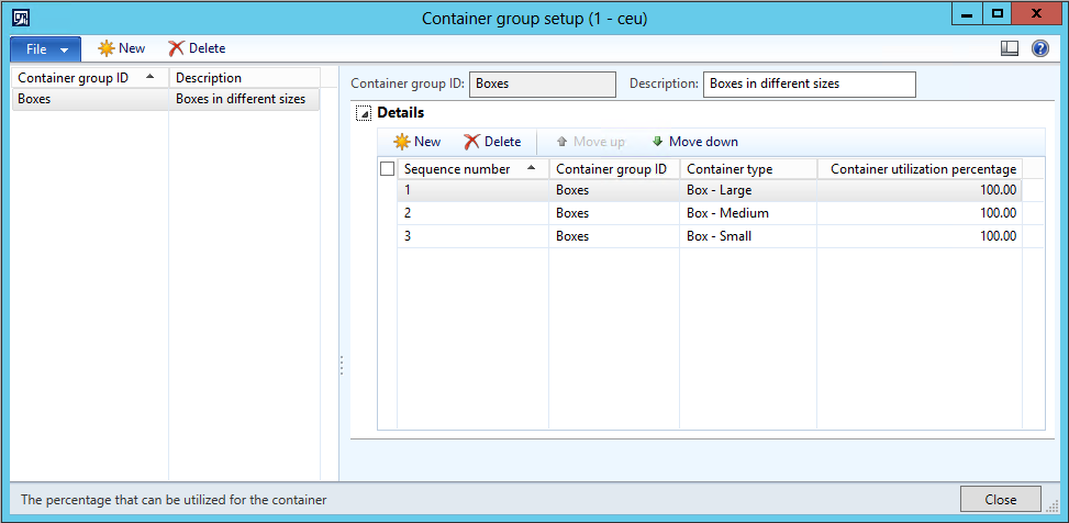 Figure 4. Container group setup (Warehouse management > Setup > Containers > Container groups)