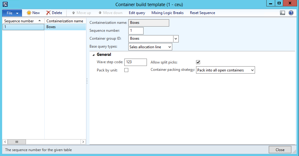 Figure 5. Container build template (Warehouse management > Setup > Containers > Container build template)