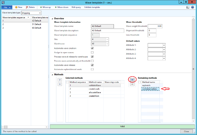 A wave template is the entry point to the containerization process. In the screenshot above, the containerization method is shown as an optional method on the right side of the window. To enable containerization, move it to the Selected methods pane on the left by clicking the arrow button.