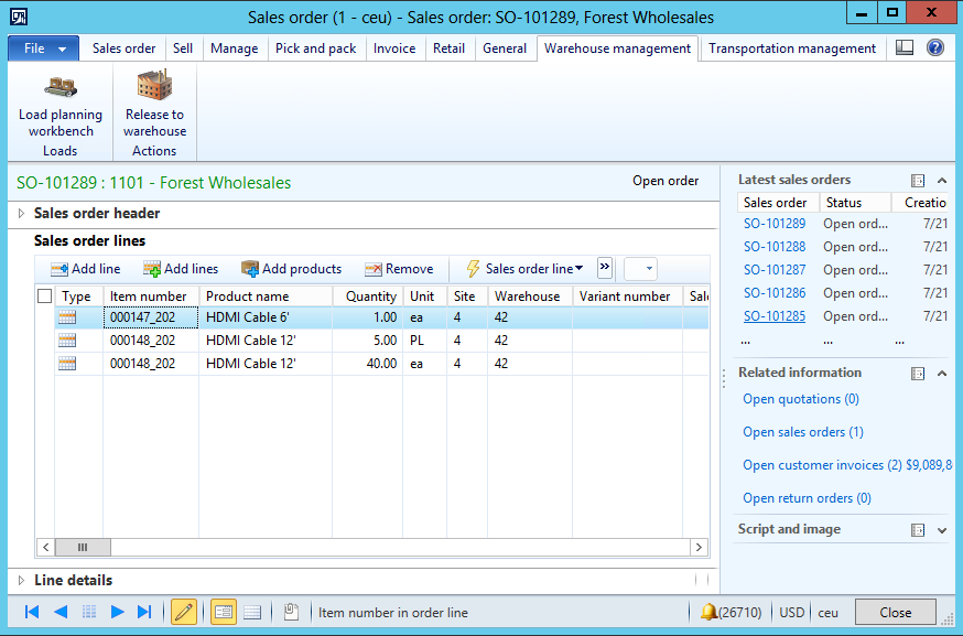 Here we have a sales order with three lines. For the first item, we only have one EA and for the second item, we have some quantity that is in PL and some that is less than one PL quantity (1PL = 50EA for 000148_202). Assume that we have enough on-hand inventory for both items and all sales lines have been reserved.