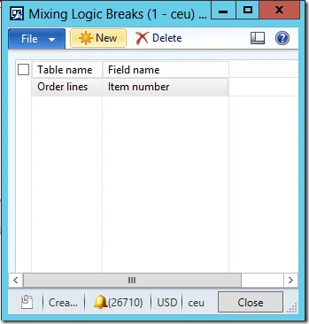 - Mixing logic breaks: Click the button on the action pane to open the form shown in Figure 6. This form allows you to add fields by which you want the system to split the items into a new container. For our example, I added the Item number field, which means that when assigning items to containers, the system should create a new container when there is a new item number. This is so that different items will not be packed into a same container.