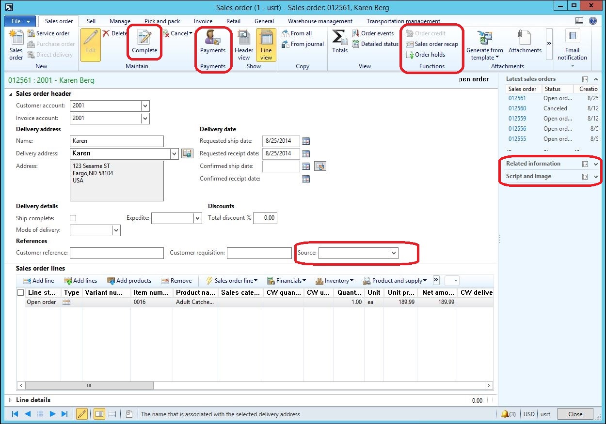 When these features are selected and a Call center channel user creates a sales order, the sales order form will display different buttons and fields as seen below with a few highlights of the newly available options: