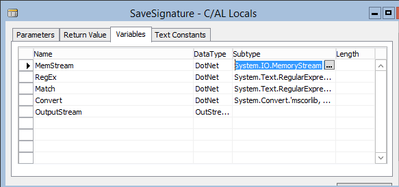 So, let’s create a SaveSignature method and add the following .NET type variables to the locals: