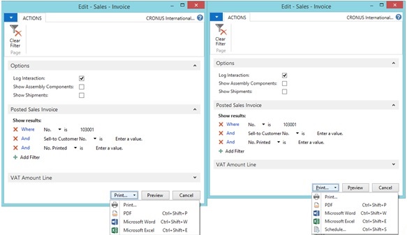 It is important to note that most document reports are run by using the Report Selection feature, which uses the RUNMODAL command to execute reports in sequence. Therefore, when printing, for example, a Sales Invoice, the user will not see a Schedule option on the report request page. However, if the Sales Invoice report is run directly from Object Designer in the development environment, the request page will include the Schedule option, as illustrated in the following figure.