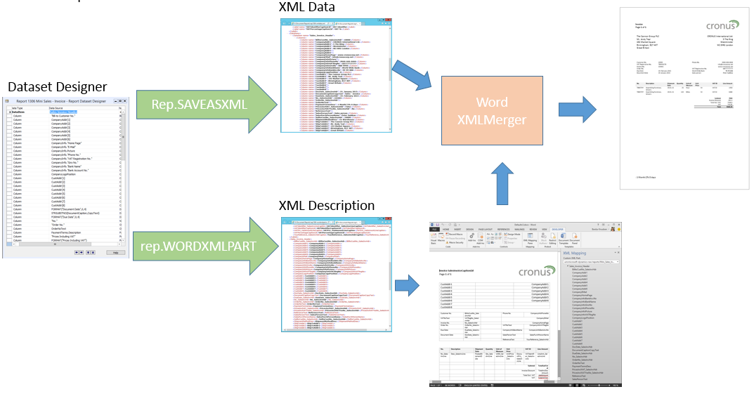When report is executed, the report data output is merged with the Word layout to produce the final report. The report data output is in XML format which has the same form as the output of the REPORT.SAVEASXML function. The merge operation uses the .NET Framework assembly Microsoft.Dynamics.Nav.DocumentReport. The merge operation happens on the Microsoft Dynamics NAV Server and it uses additional.NET Framework components, such as Open XML SDK 2.5. Word is not required on the computer that is running Microsoft Dynamics NAV Server. If the user has requested to view the report as a PDF document, then the Word document is converted from a .docx file type to a .pdf file type by the .NET Framework assembly Microsoft.Dynamics.Nav.PdfWriter.WordToPdf.