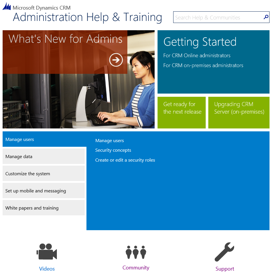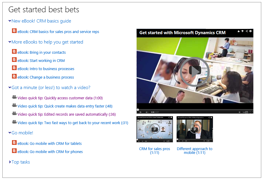 CRM Help & Training – The place to find end-user help and training. Videos, e-books, quick reference guides, walkthrough topics, FAQs, and more.