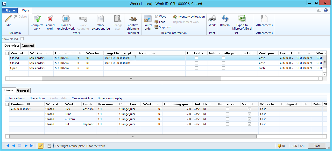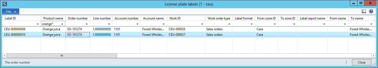 Work type print was added to the work template, and then a Work line of type Print was used to print a license plate label. A work line of type Print is only carried out once per work order. To mimic the printing of a label per case, one work order had to be created per case.
