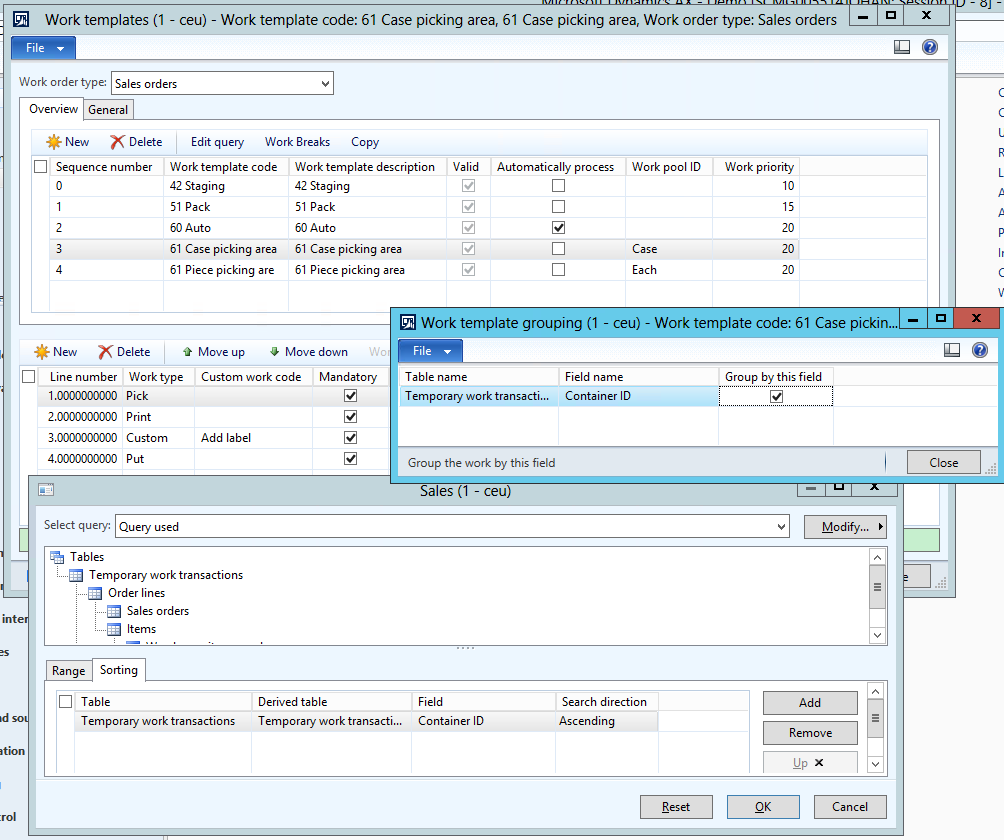 - The Container ID was added to the sorting in the query. Any field from the temporary work transactions table that is used for sorting is inserted into the work break table.
