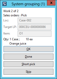 In principle, the work order for the piece picking area will need to be performed as well, but it is not relevant for this example.