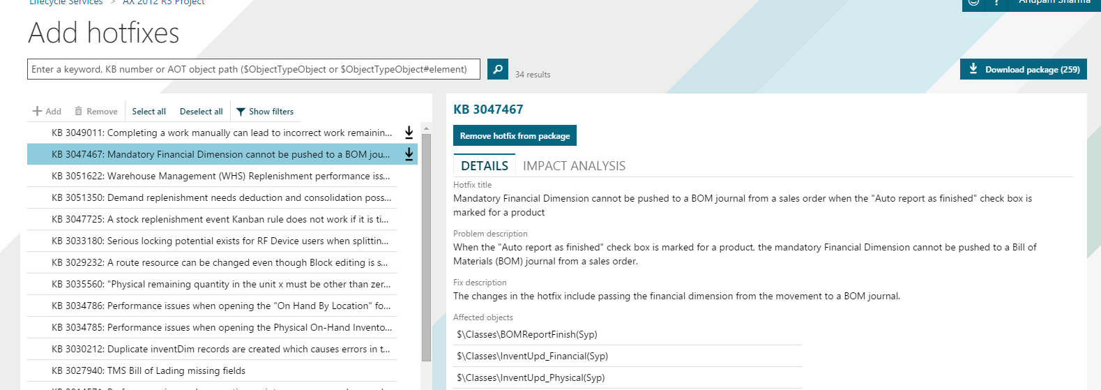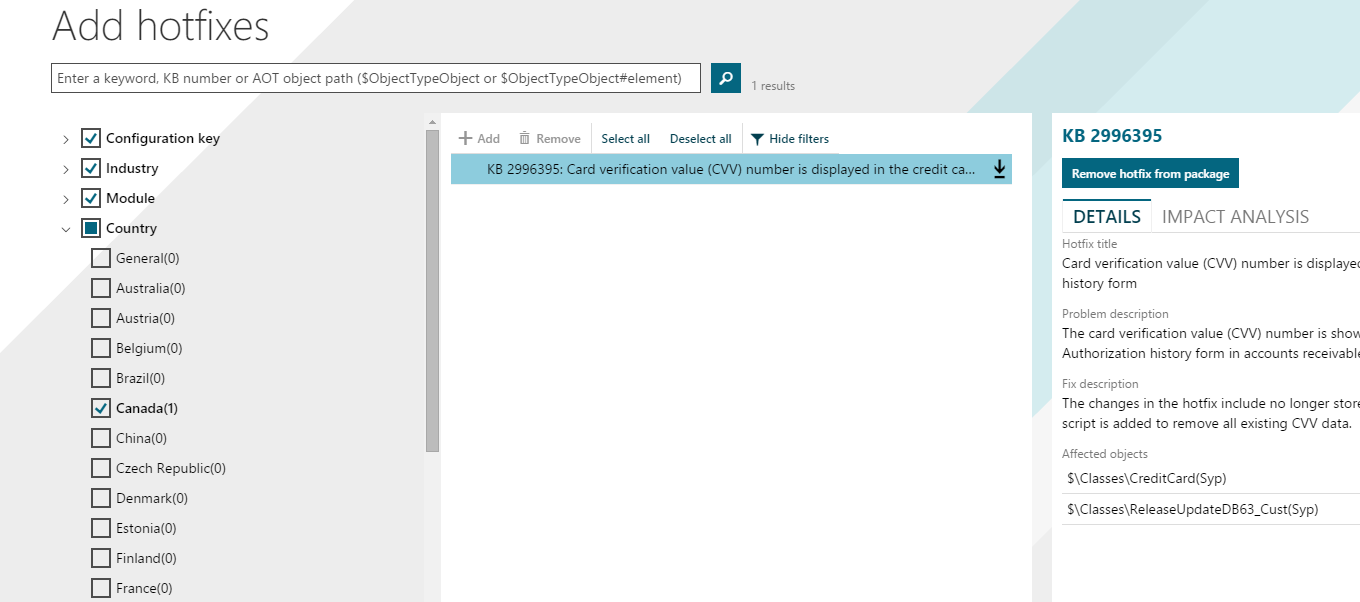 You can select an update and click the Impact analysis tab to see the impact of each hotfix on your customizations. For example, if a class has been customized in your environment and if a hotfix affects that class, one class is listed as impacted.