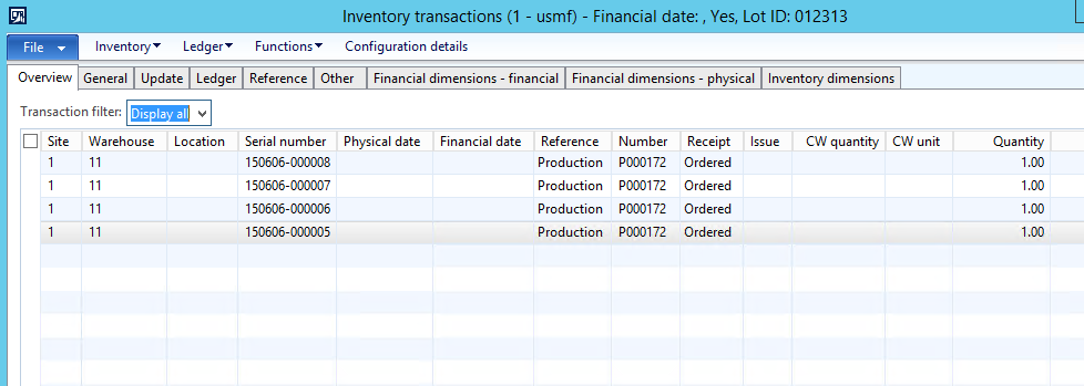 Following are the detailed steps to set this up with the above settings on the creation of the serial number group including the creation of the component and finished good all the way through to the production order. These step utilize the USMF sample data. There may be minor variations using other data, but as long as the above settings are applied, you should see the same result.