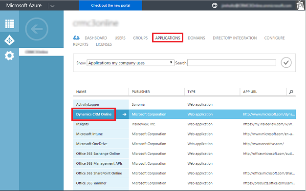 3. Click Applications, and then click the Dynamics CRM Online web application.