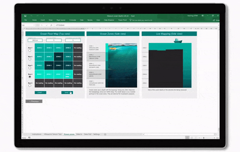Microsoft’s Hacking STEM enables you to conduct affordable inquiry and project-based activities to visualize data across science, technology, engineering, and math curriculum. Hacking STEM projects explore a relevant question and provide multiple experiences—both physical and digital—to investigate the topic. One math-focused lesson poses the question “How deep is the ocean?”, prompting students to explore remote terrains by modeling and graphing the ocean floor with an ultrasonic sensor to visualize organisms that live in different ocean layers. Teachers love that this lesson is an engaging exploration that not only facilitates math skill development, but interest in the natural world. And many teachers are surprised that Excel can be such a rich and engaging tool for students!