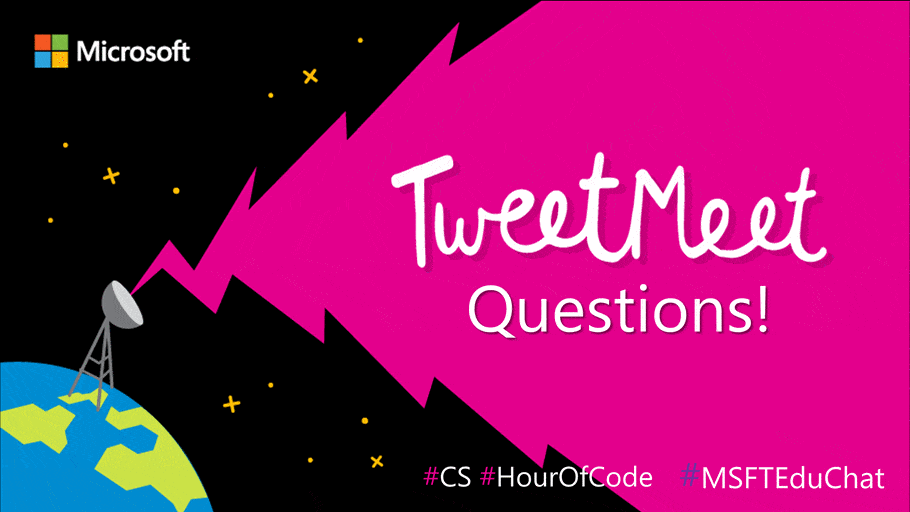 Join us Tuesday, November 20 from 10 a.m. to 11 a.m. PDT on Twitter using the hashtags #MSFTEduChat, #CS, #HourofCode, #CSEdWeek and #MicrosoftEDU (which you can always use to stay in touch with us). To find the event time for your specific location, use this time zone announcer.