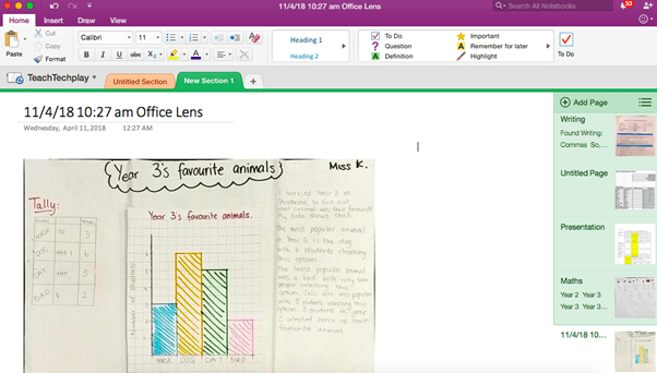 Inserting snapshots of student work into OneNote is made simple with the Office Lens app. These two tools create a wonderful workflow to quickly take a photo of student work and then directly insert it into the relevant page within OneNote. It produces a digital copy of the student work that I can annotate over and refer back to when needed.