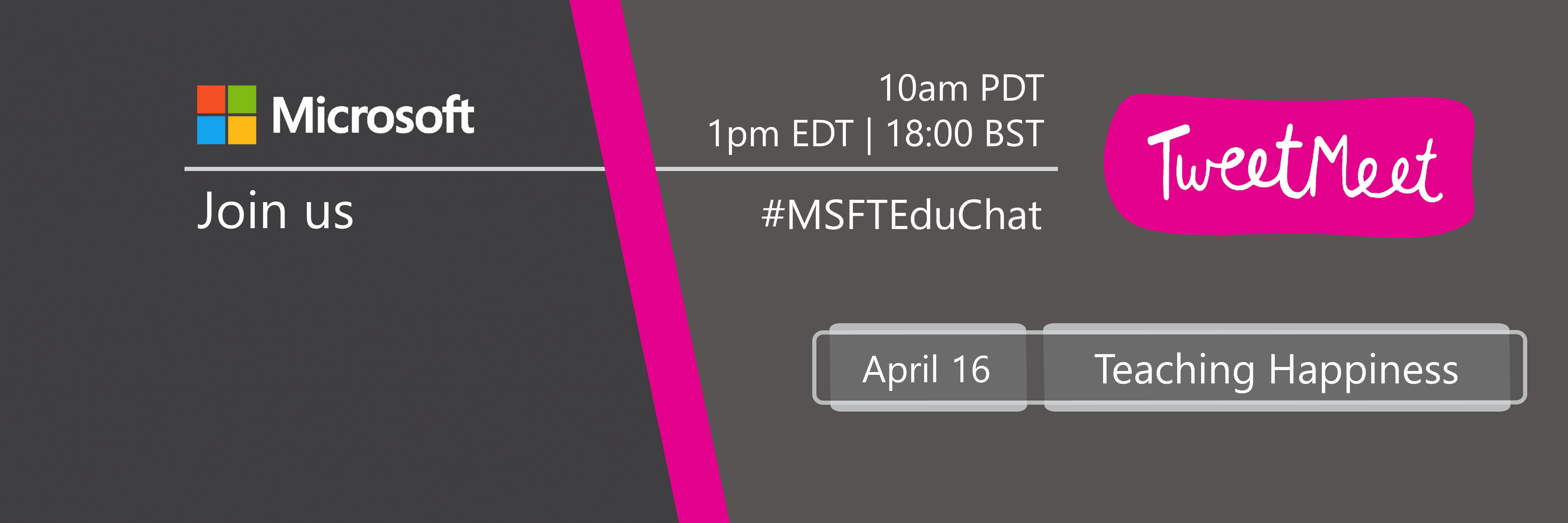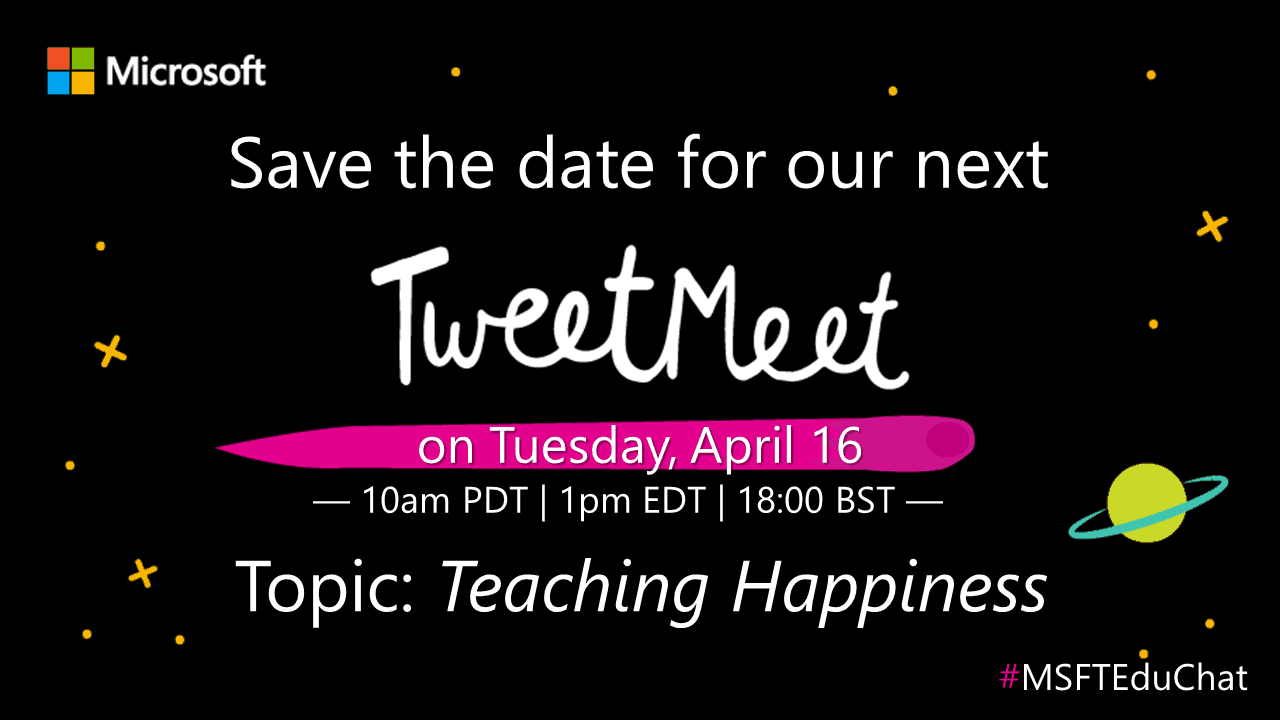 Join us Tuesday, April 16 from 10 a.m. to 11 a.m. PDT on Twitter using the hashtags #MSFTEduChat, #TeachingHappiness, #SEL and #MicrosoftEDU (which you can always use to stay in touch with us). Be sure to double-check your own local event time, as this may be different this month. You can find the event time for 215 countries with this time zone announcer.