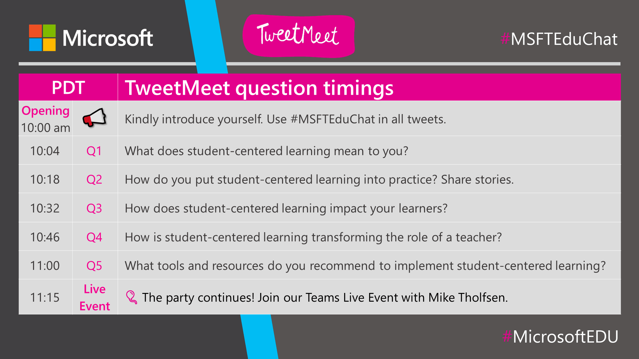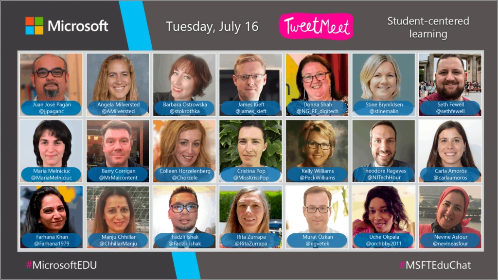 TweetMeets are monthly recurring Twitter conversations about themes relevant to educators, facilitated by Microsoft Education. The purpose of these events is to help professionals in education to learn from each other and inspire their students while they are preparing for their future. The TweetMeets also nurture personal learning networks among educators from across the globe.
