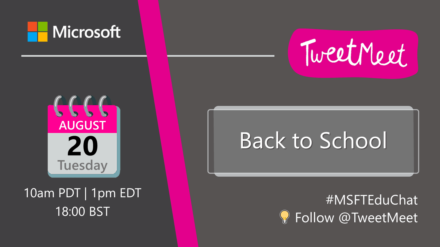 On August 20, right after the Back to School Facebook Live event, we’re bringing you two more opportunities for inspiration ahead of the new school year: an #MSFTEduChat TweetMeet and a Teams Live Event.