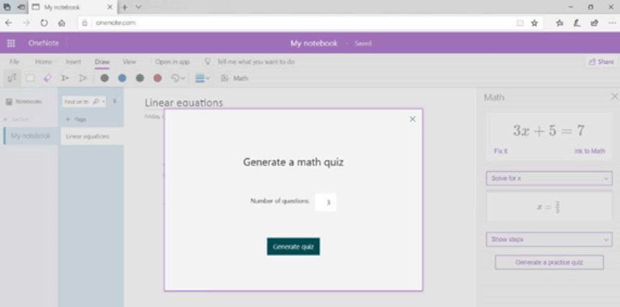 - And math practice quizzes are now available in OneNote Online. Students can use the Math assistant in OneNote Online to generate a quiz. We’ve also just launched an interactive guide for inclusive math.