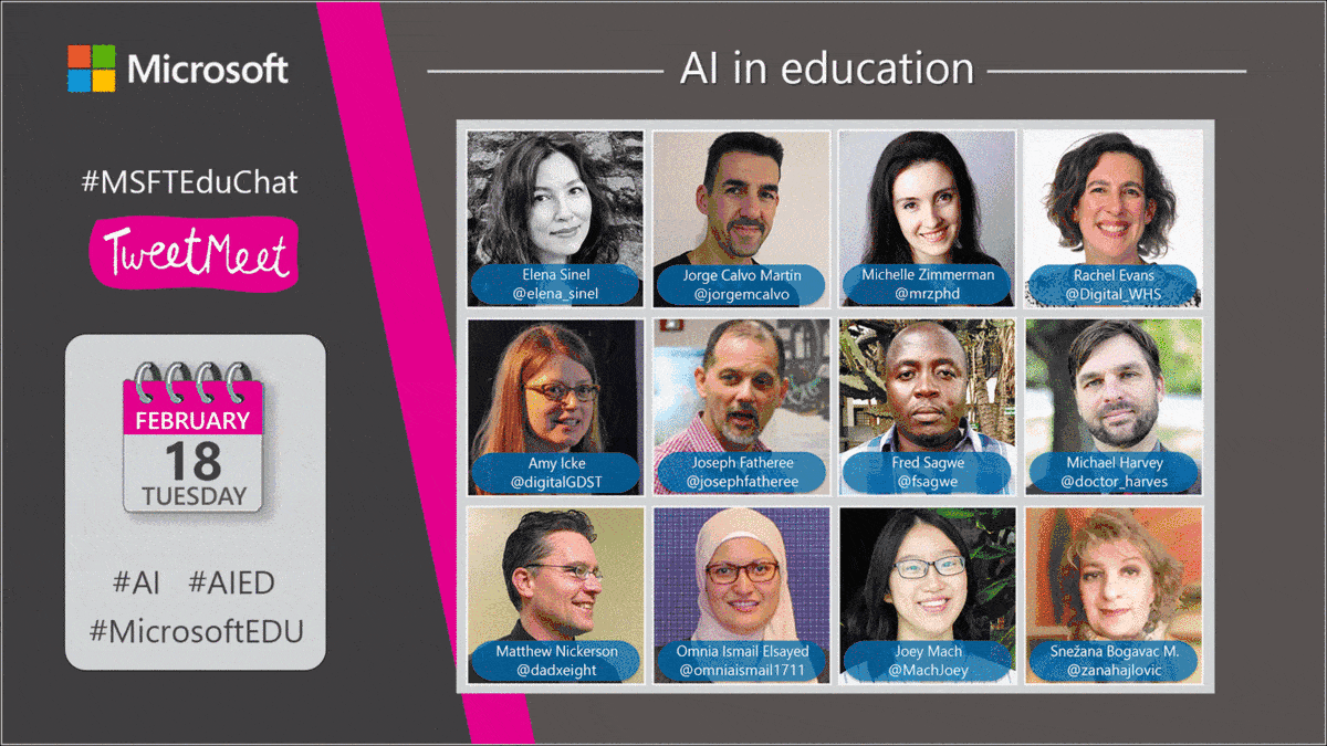 Join us Tuesday, February 18 from 10:00 a.m. to 11:15 a.m. PST on Twitter using the hashtags #AI, #AIED, #MSFTEduChat, #TweetMeetEN and #MicrosoftEDU. Be sure to double check your own local event time. You can find the event time for 215 countries with this time zone announcer.