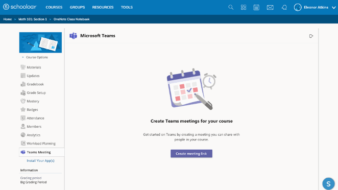 Schoology users with Office 365 accounts can create Teams meetings from within Schoology for free. Once the Teams app has been installed, head over to any course and create a meeting to host a virtual class.