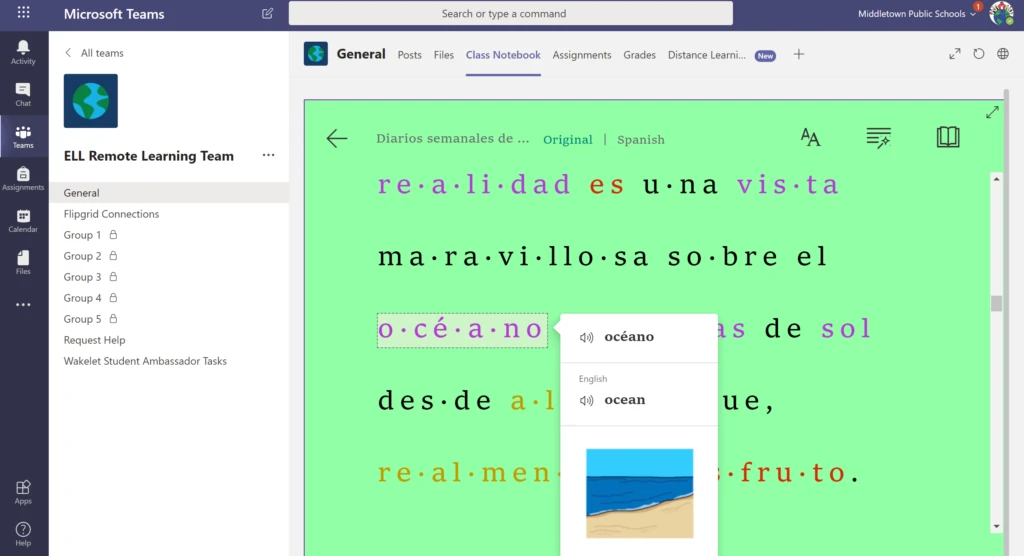 The Immersive Reader is also available in OneNote Class Notebook, which is integrated into Teams. My English Learners are using the translation and read-back features to complete my assignments as well as their work in other classes. The Immersive Reader has also helped me connect with our international families. I have used it to translate documents to send to parents, such as the grab-and-go food pickup instructions, the form for requesting laptops and hotspots, and the instructions for activating the hotspots. Having these translated documents has given families access to resources that might have otherwise been unattainable. The developers of the translation tools probably never thought that their creations would be used in the ways we’re using them now, given our current situation.