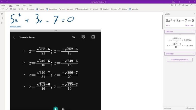 OneNote has long had the ability to embed Forms on the canvas, and more recently we added the Immersive Reader for Forms. With our most recent update, students can now enable the Immersive Reader for Forms embedded into OneNote. This works for Math Quizzes in OneNote and complex equations. To access this, in the Form in OneNOte, choose the “…” menu, and then Enable Immersive Reader