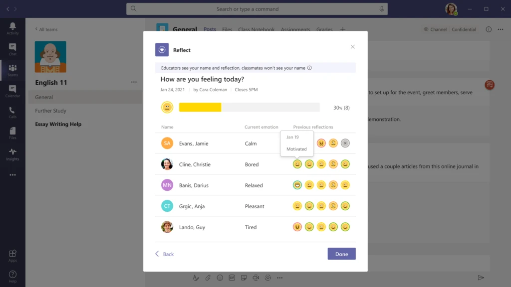 That’s the idea behind Reflect, a free app coming this spring to Microsoft Teams, that uses polling to help educators strengthen relationships with students and gain insight into their well-being. Reflect, which will also integrate with Education Insights, enables educators to share questions designed to support social and emotional learning. These can be specific questions like, “How are you feeling about the material we covered today?” or more routine check-ins like, “how did this week feel for you?” Educators can customize poll settings for different topics and privacy preferences.