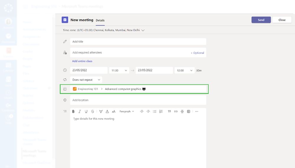 Another new feature lets you create channel meetings from within Canvas in the Teams Meetings LTI. This allows meetings to take place within a Class Team—giving automatic access to all the rich Teams collaboration features in one channel.