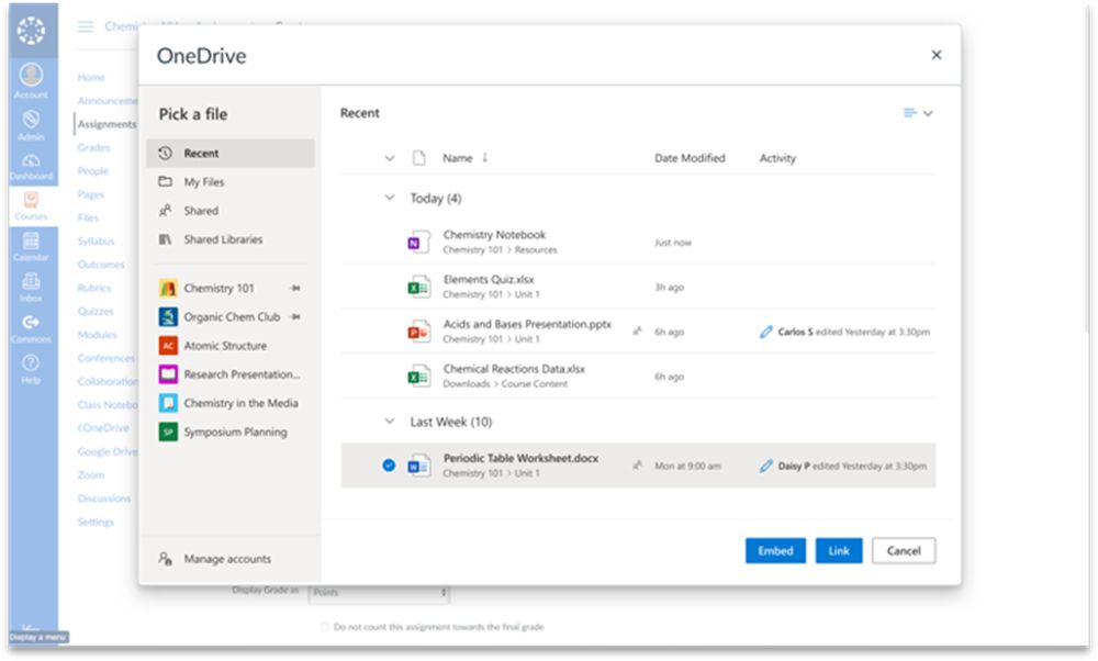 Educators and students can now access their shared files and Teams files directly within the OneDrive LTI in Canvas. This makes it easier than ever to bring your shared files and collaborative work into the Canvas experience. Using the OneDrive LTI, you can create assignments, start collaborations, or simply add cloud files to your course outline and pages in Canvas.