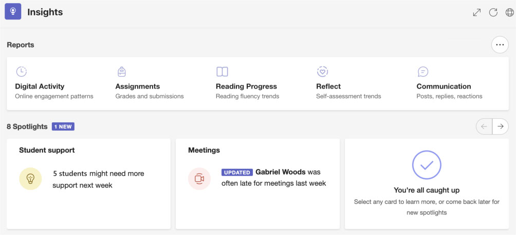 Educators know their students best. The student support spotlight cards in Education Insights highlight  students’ most current learning and engagement. These cards provide educators with information about students who need extra support. For example, the cards may show students struggling with a particular assignment or having difficulty keeping up with class activities.