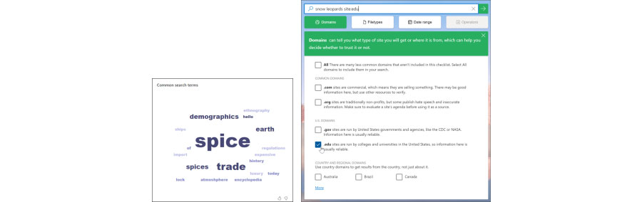 Education Insights provides data from these tools to help inform educators on how their students are progressing using these future-ready skills. For example, Search Coach data includes how many searches the class has tried, which filters they applied, and the most common domain they used. It also creates a word cloud of common search terms. At-a-glance, the educator can visually evaluate the effectiveness of students’ search terms and if necessary, help guide students on how to create better queries for their assignment.