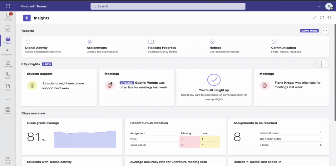 Education Insights in Microsoft Teams is part of the Learning Accelerators suite that uses at-a-glance data views to help educators track their students’ Teams and Microsoft 365 activity, from assignment turn-in to engagement in class conversations. Education Insights is a game-changing tool for educators looking to streamline instruction and individualize student learning. It can empower educators to save time and focus on what matters most: helping their students succeed.