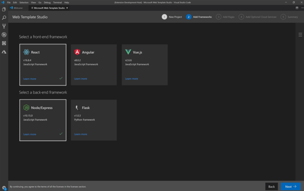 Web Template Studio screenshotIn addition to managing the opensource feedback provided following the launch at Build 2019, the interns spoke to current users, student developers, hackers, and more to understand where Web TS could be enhanced. In addition to requests to deepen the bench of supported frameworks, the team also honed in on the value the solution could provide to the novice developer with a foundation of experience creating web apps.