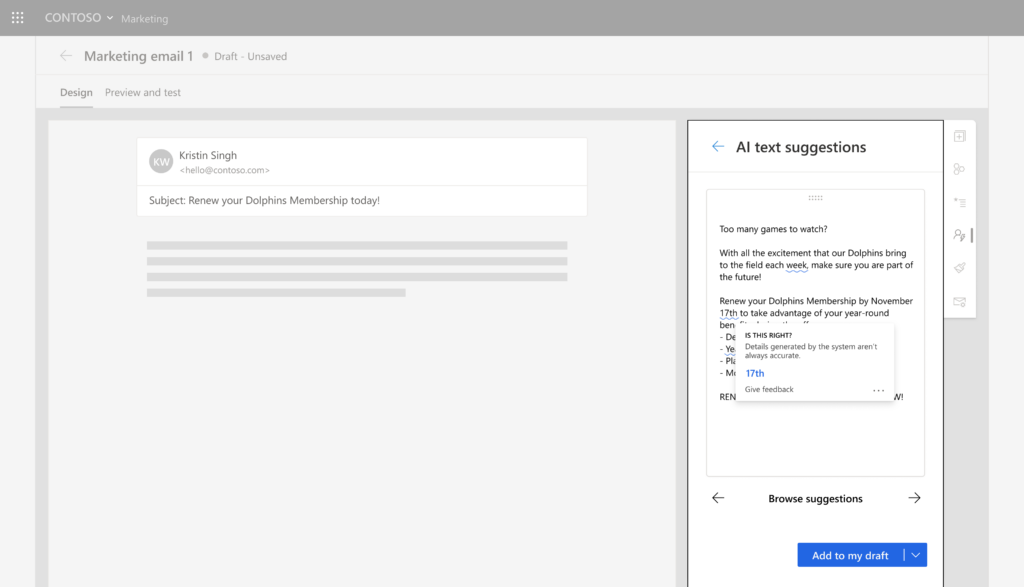 In this hypothetical product, users submit key points, and the system generates text suggestions using GPT-3. The product then flags numbers and dates in the generated suggestions to remind users to check the accuracy of those details, since these are details GPT-3 sometimes gets wrong. This is one way of reporting system performance information (Pattern 2C).