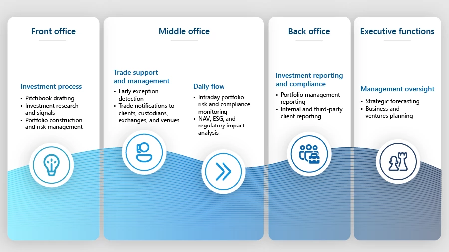 - Finally, in the back office and executive functions, firms can benefit from enhanced reporting to improve decision-making through increased speed and relevance both internally (to adjust strategy and for remediation) and externally (to improve client experience and regulatory reporting).