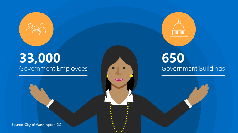 Graphic stating there are 33,000 government employees and 650 government buildingsDC’s unique infrastructure informs my office’s short- and long-term decision-making and outlines the city’s technological needs. DC’s transient population is another defining characteristic of the city. While there are only approximately 680,000 residents living within DC’s city limits as of the 2016 census, daily commuters and other visitors increase the city’s population to over a million people every day. The city’s hundreds of thousands of visitors might not be full-time residents, but my staff and I are still required to provide the same city services for DC’s transient population as we do for our local citizens. For us, Microsoft offers a strong government cloud platform and services that help me and my staff perform our jobs effectively and create the city’s digital future.
