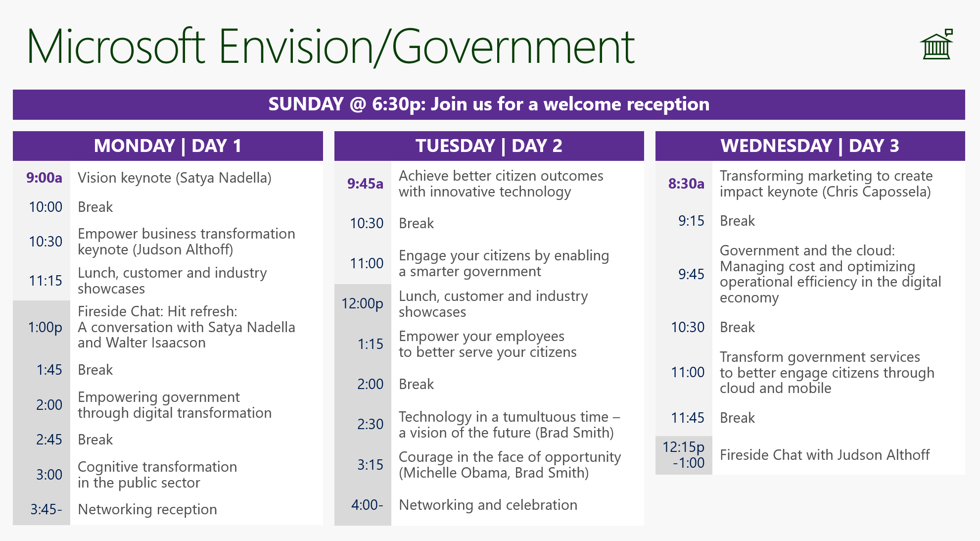 This is just a sampling of the content that’s aimed at meeting or exceeding the expectations of government representatives attending Envision, which also features an impressive lineup of visionaries and experts, including Beth Comstock, Michelle Obama and Satya Nadella. When coupled with the immersive experience of our Digital Transformation Showcase and the invaluable opportunity to share top-of-mind challenges, ideas and insights with government peers, Envision is sure to inspire attendees to take the next step toward digital transformation!