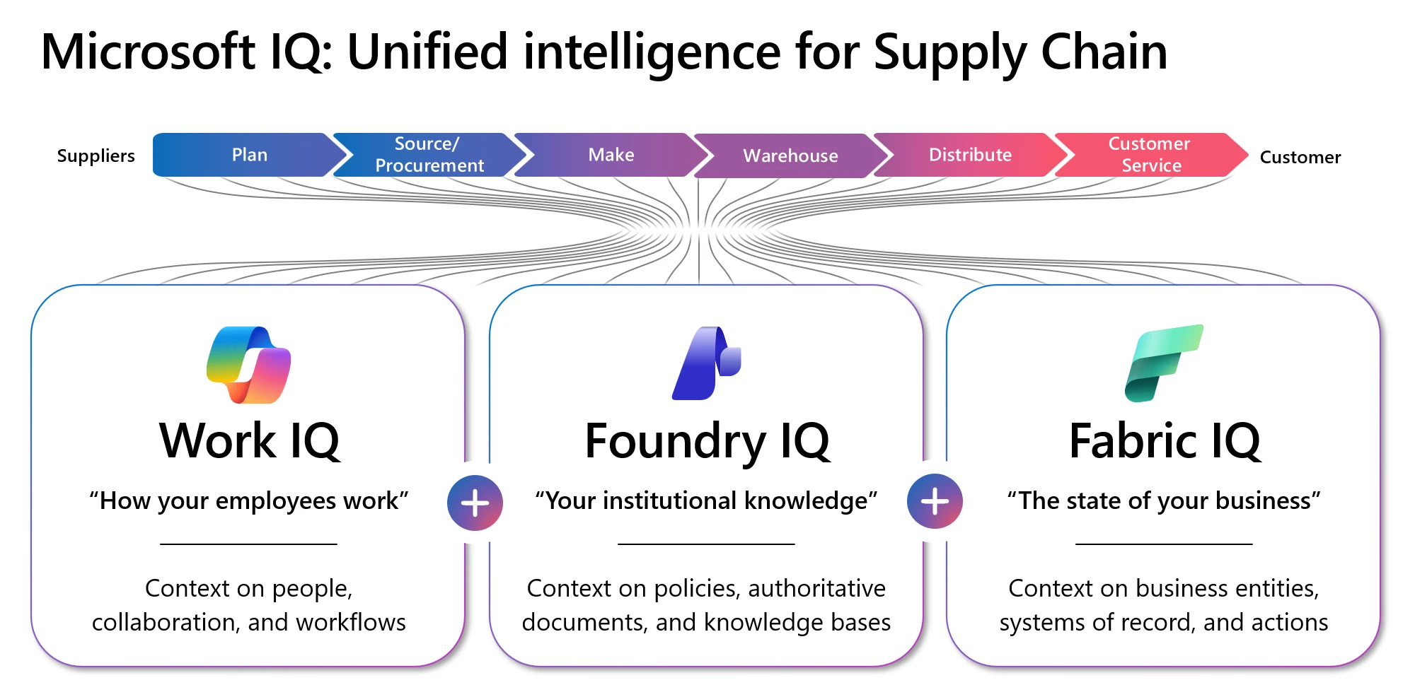Microsoft Work IQ, Foundry IQ and Fabric IQ together form an intelligence layer for supply chains—from demand planning to inventory and customer service—that connects how people work, how the business operates, and what the organization knows. This gives AI agents full enterprise context so that agents can reason, simulate scenarios, and act in line with real-world constraints and KPIs such as inventory turnover to support better decisions.