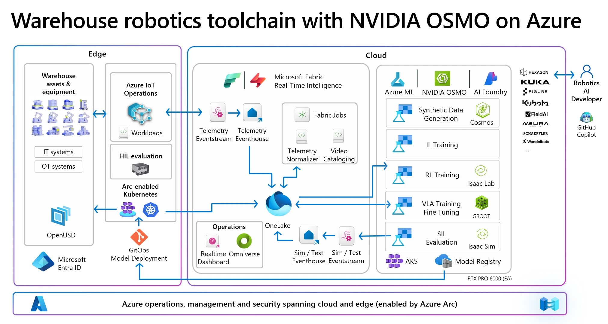 Microsoft is pushing the frontier of physical AI with it’s new Rho‑alpha robotics model that combines natural language, visual perception, and tactile feedback to make robots more adaptive and autonomous. Microsoft has launched an early access research program with selected partners to advance co‑training and domain adaptation and aims to integrate the model in Microsoft Foundry in the coming months. Already today, customers and partners may take the below robotics toolchain reference architecture to train and deploy warehouse robotics with NVIDIA Osmo on Azure.