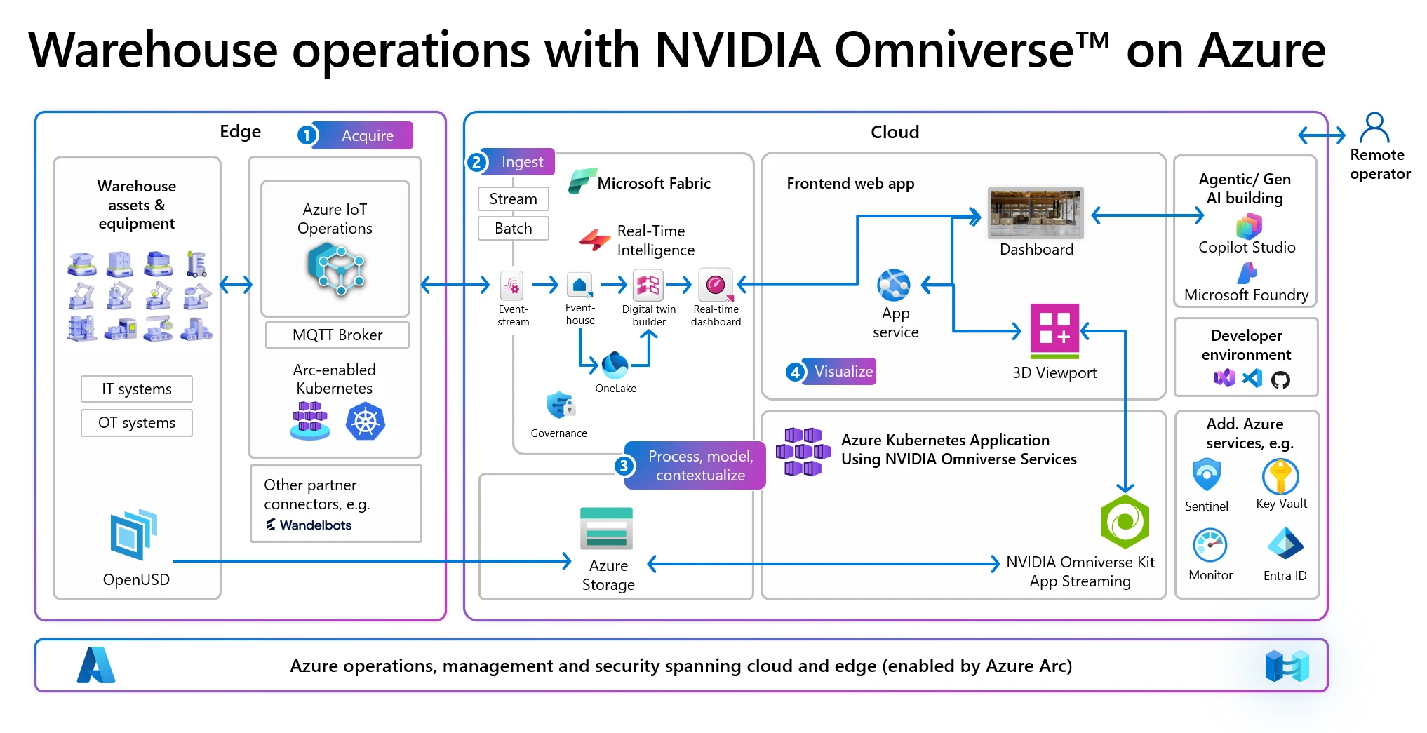 Inside the physical warehouse, operational data from robotic arms, conveyors, and warehouse sensors are captured on the edge using Azure IoT Operations running on Arc-enabled Kubernetes and using MQTT broker. The architecture adopts the Universal Scene Description format (OpenUSD) to ensure that 2D, 3D, and point cloud geometry from the warehouse can be seamlessly integrated into the digital twin. Microsoft Fabric takes up the data in the cloud to provide a unified analytics foundation. Eventstream and eventhouse capture incoming telemetry as real-time streams or batch data. Microsoft OneLake acts as the governed, centralized data lake that consolidates all warehouse data. Digital twin builder transforms raw IoT signals into a contextualized virtual representation by mapping telemetry to the warehouse’s digital model. Powered by NVIDIA Omniverse, high-fidelity simulation and spatial computing occur creating a real digital twin which is streamed directly to the browser—eliminating the need for high-end local hardware. Tools such as Microsoft Copilot Studio and Microsoft Foundry enable natural language interaction. Across all stages, security is maintained through Azure Arc, ensuring consistent governance, configuration, and policy enforcement across edge and cloud.