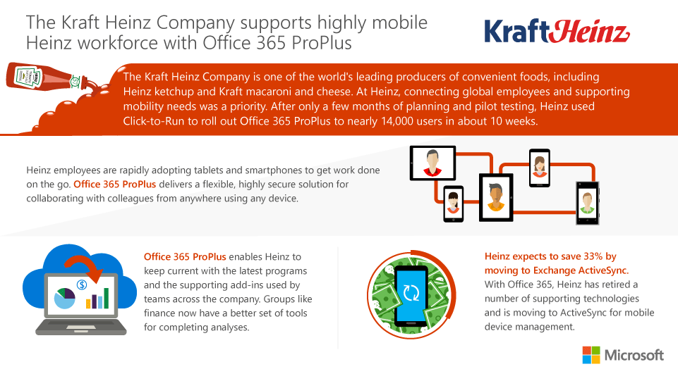 According to The Kraft Heinz Company’s North America CIO Leandro Balbinot, “Our employees are rapidly adopting tablets and smartphones to get work done on the go. Office 365 ProPlus is a flexible solution for accessing files and communicating with colleagues from anywhere using any device.”