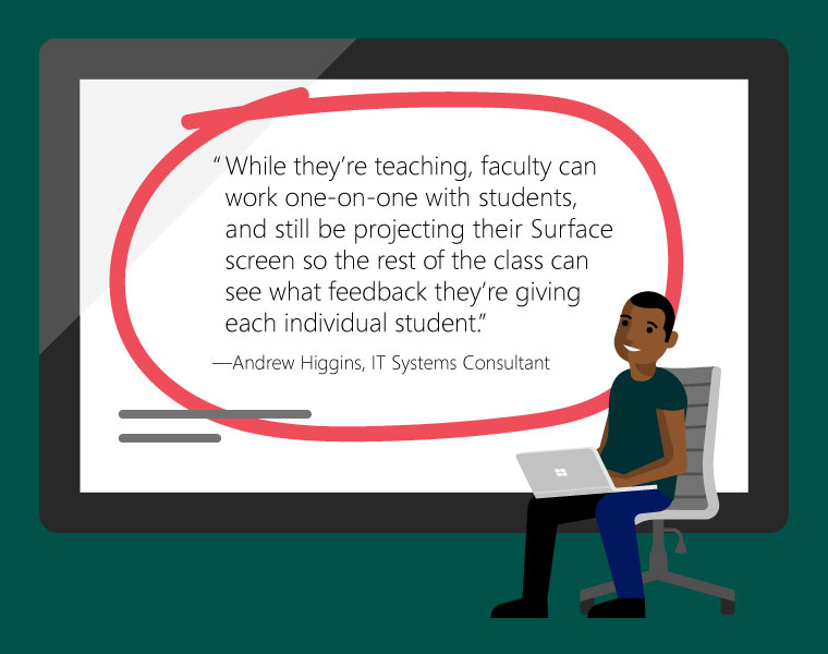 “Faculty use their Surfaces to walk around the room, and walk right up to students,” explained Higgins. “While they’re teaching, faculty can work one-on-one with students, and still be projecting their Surface screen so the rest of the class can see what feedback they’re giving each individual student.”