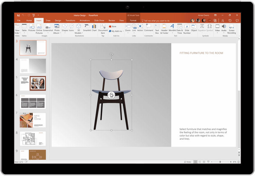 Easily insert 3D objects in PowerPoint from the Remix 3D catalog or your desktop.