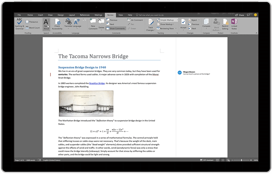 Read Aloud in Word—We continue to improve the Learning Tools available in Word and have moved Read Aloud to the Review tab. This latest update allows your document to be read back to you with simultaneous highlighting—from right within your workflow. This makes it easier to recognize and correct errors as you write, improving reading and editing accuracy for everyone, especially users with learning disabilities such as dyslexia.