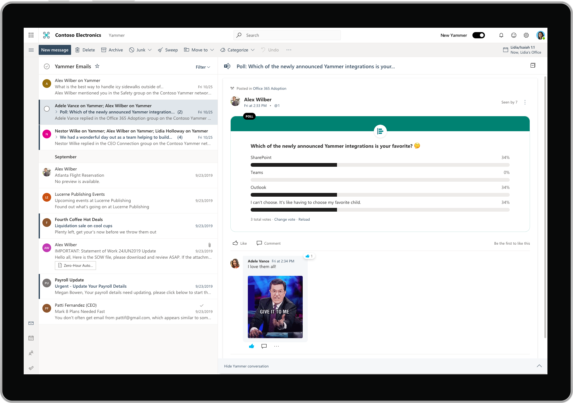 Engage with Yammer conversations directly within your inbox—The new interactive Yammer emails in Outlook on the web enable users to interact with Yammer conversations, polls, and questions, and deliver praise. Now you can see the full Yammer thread and reply, like, vote, attach files, share GIFs, and even watch videos right from your inbox. These features are now available to all Enterprise tenants with releases in Outlook for Windows, Outlook for Mac, and Outlook for iOS and Android coming next quarter.
