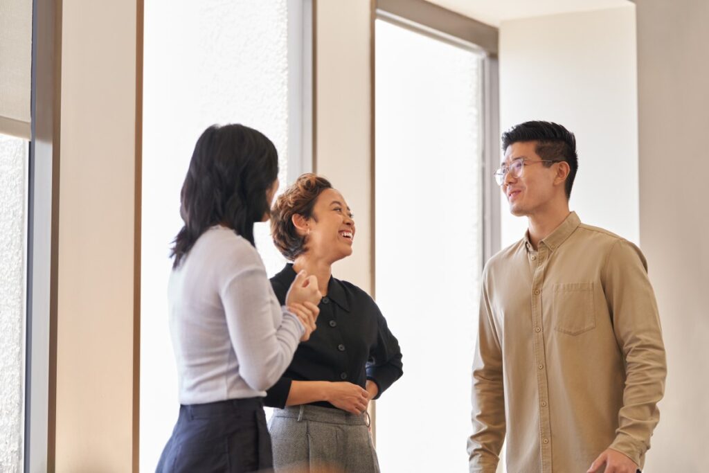 Two women and a man having a conversation standing in an office hallway.