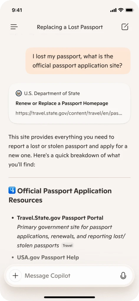 To make discovery smooth and effortless, we’re introducing dedicated navigation links at the top of responses. For example, simple queries such as “amazon” or “TripAdvisor NYC” will give you a simple link where a single click takes you exactly where you need to go—just like the familiar experience of how search has worked for years. Soon, complex queries such as “I lost my passport, what is the official passport application site?” will generate a response linking to the exact site you need to go to. Search is the best of both worlds—speed and depth—designed to keep you in control.