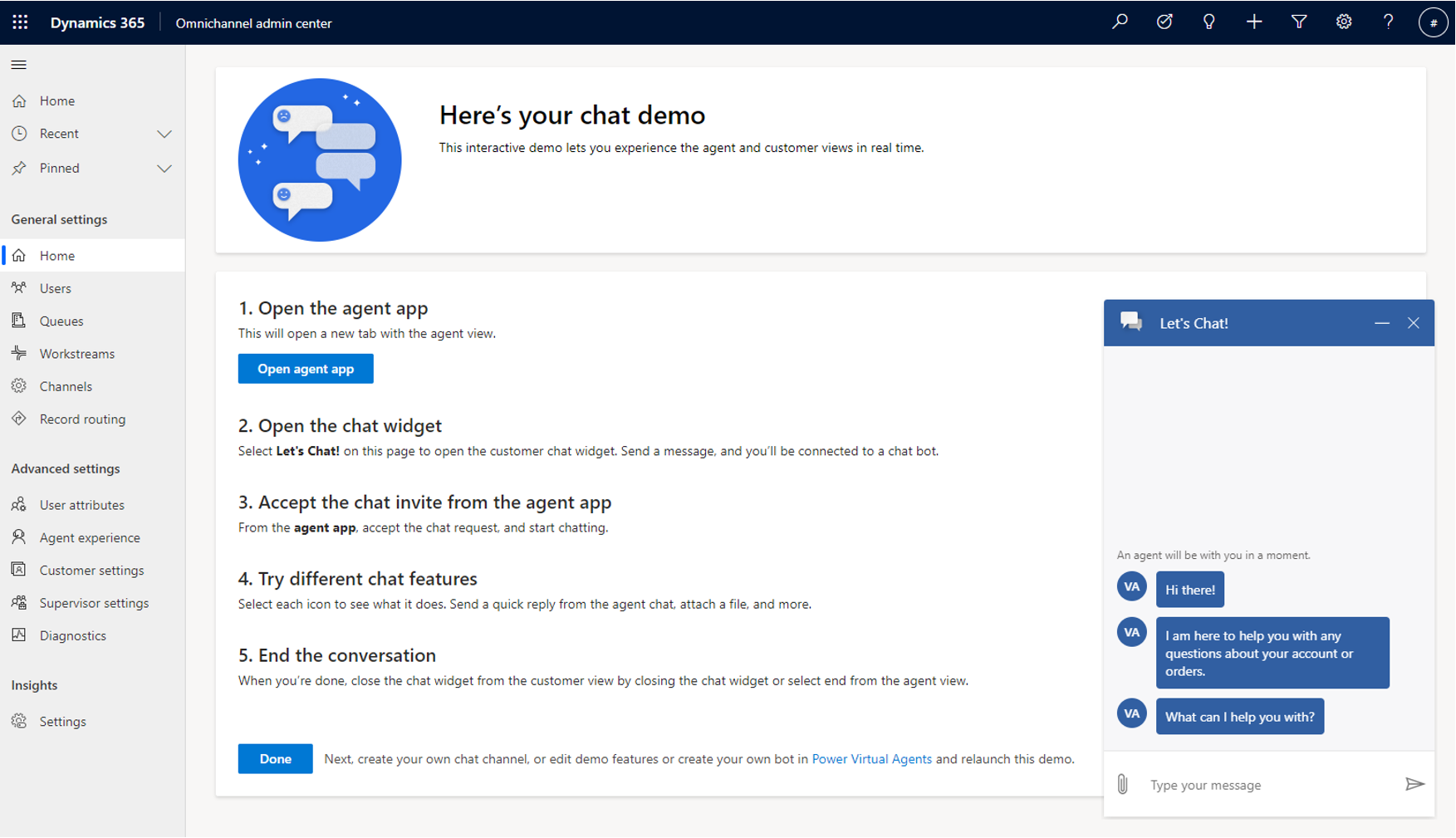 Dynamics 365 Omnichannel now has new first run experience during which Power Virtual Agents bots get automatically created, linked to the Omnichannel hub and added to the right workstream and queues making it extremely simple to get started on your journey to automation.