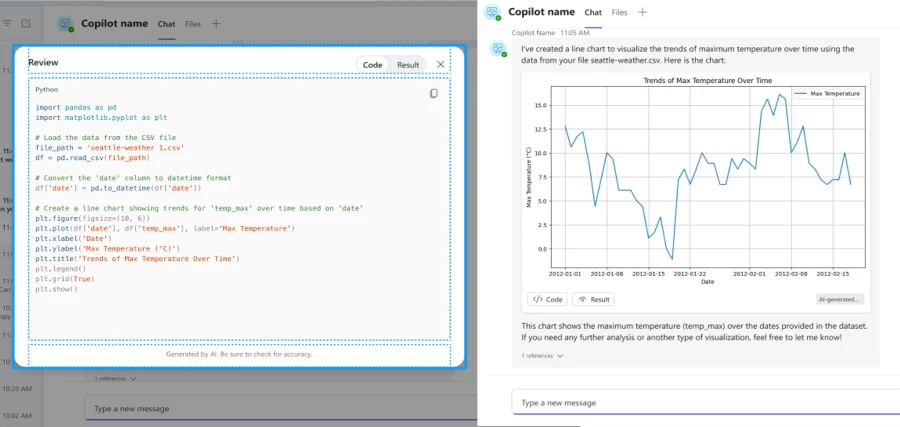 Code interpreter is now generally available in Copilot Studio and Copilot Studio lite (formerly called the Microsoft 365 agent builder), bringing powerful new ways to generate and execute Python code directly within an agent. Makers can use natural language to create Python-based actions, edit the generated code, and save prompts for reuse. At runtime, the agent executes that same code, enabling richer outputs and new possibilities for customization.